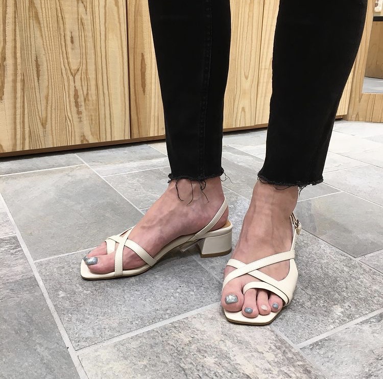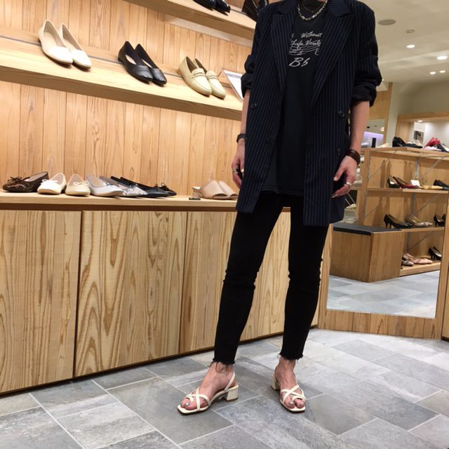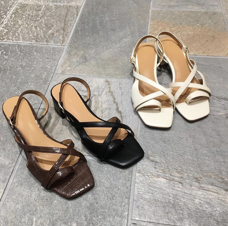 ストラップの重なり具合が絶妙なスクエアトゥサンダル。