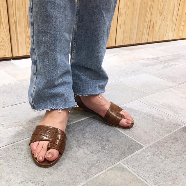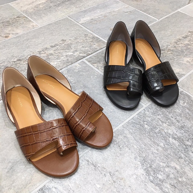 クロコ調の型押しレザーがクラシックな雰囲気のフラットサンダル。