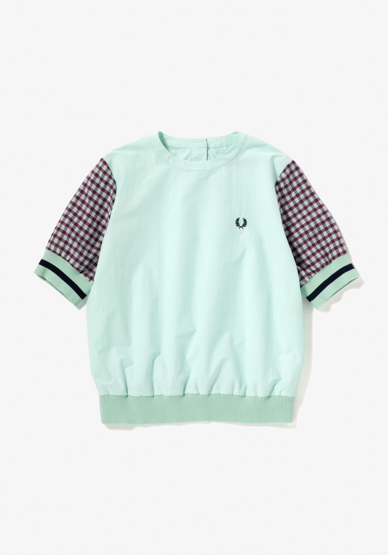 袖部分を凹凸感のあるシャツ生地で切り替え袖口と裾はリブで仕上げました。