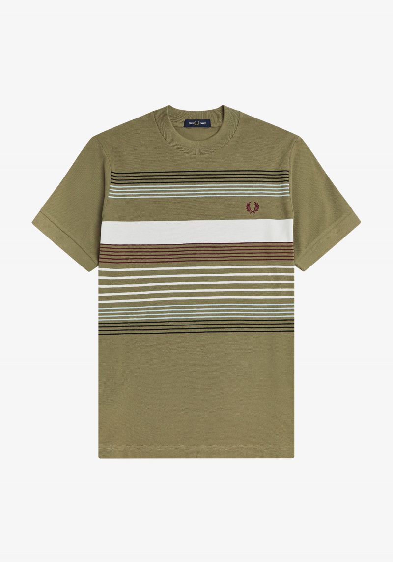 アースカラーを基調としたマルチボーダーの半袖カットソー。
