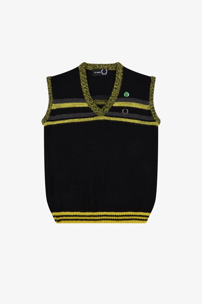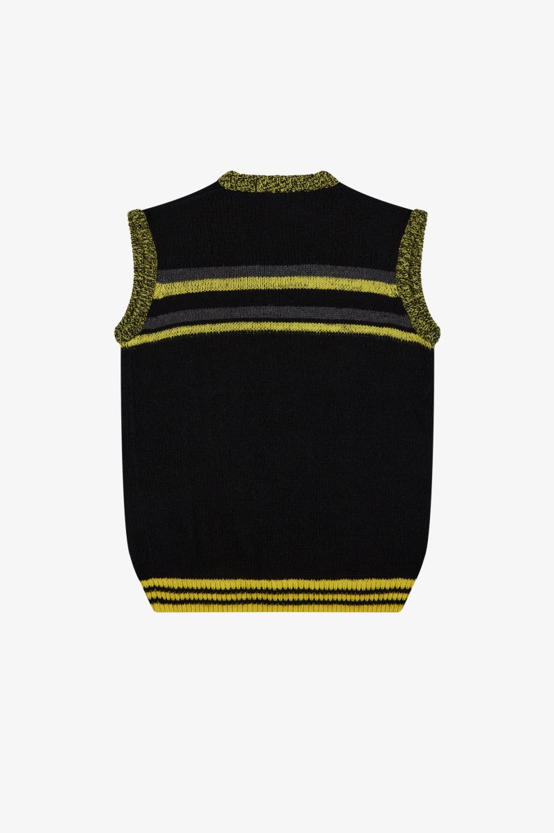 リブ部分を杢調で仕上げたマルチボーダーのニットベスト。