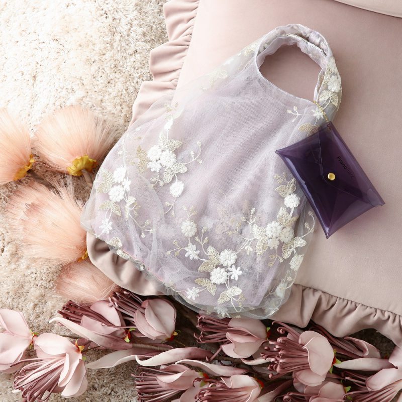 透け感のあるチュール素材に刺繍が愛らしいバッグです。
