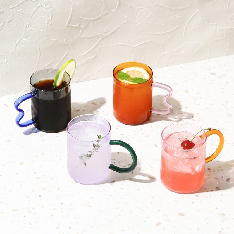 個性的な持ち手と美しいカラーリングがポイントの耐熱グラス。