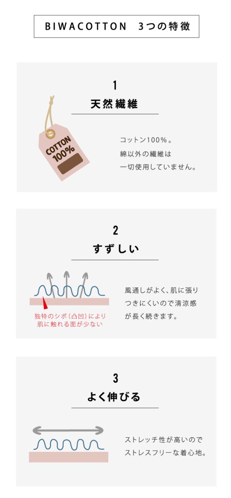 ジメジメと暑くなるこれからの季節でも、BIWACOTTONのアイテムは快適にお過ごしいただけます。