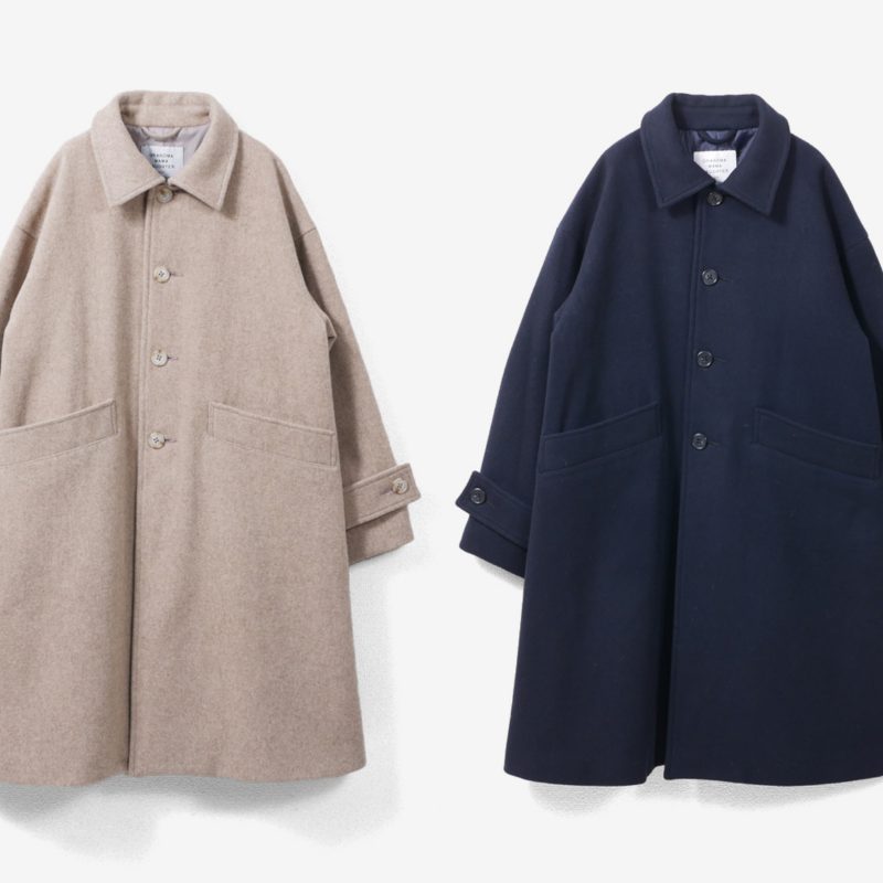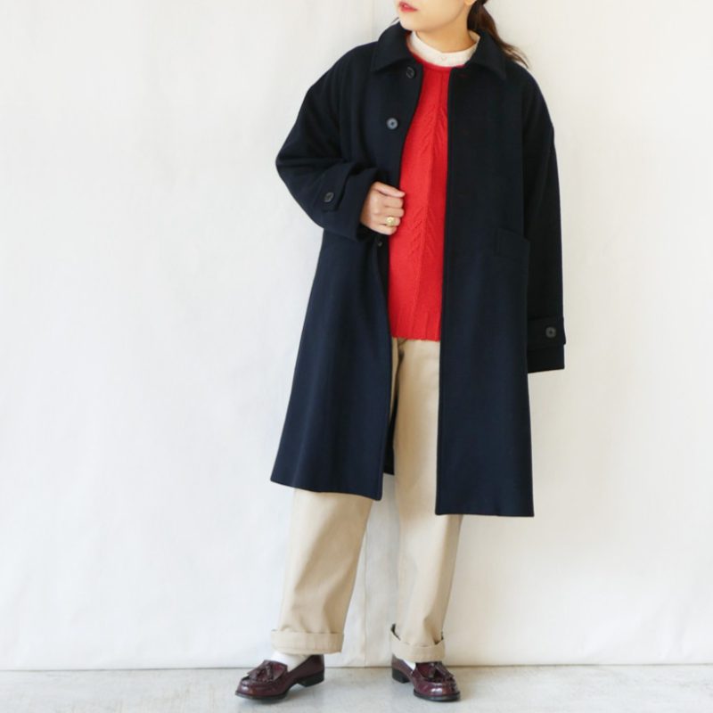 オーストラリア羊毛SP140を原料にラムウールをブレンドした高品質なソフトメルトンを使用したオーバーサイズのAラインステンカラーコート。ON/OFF問わずお使いいただけます。