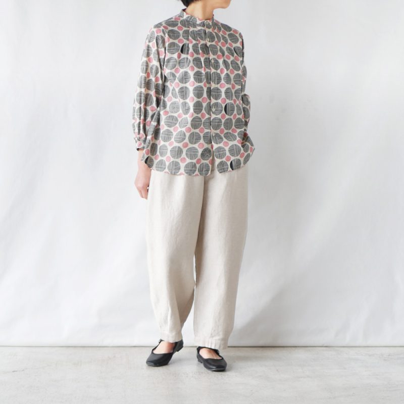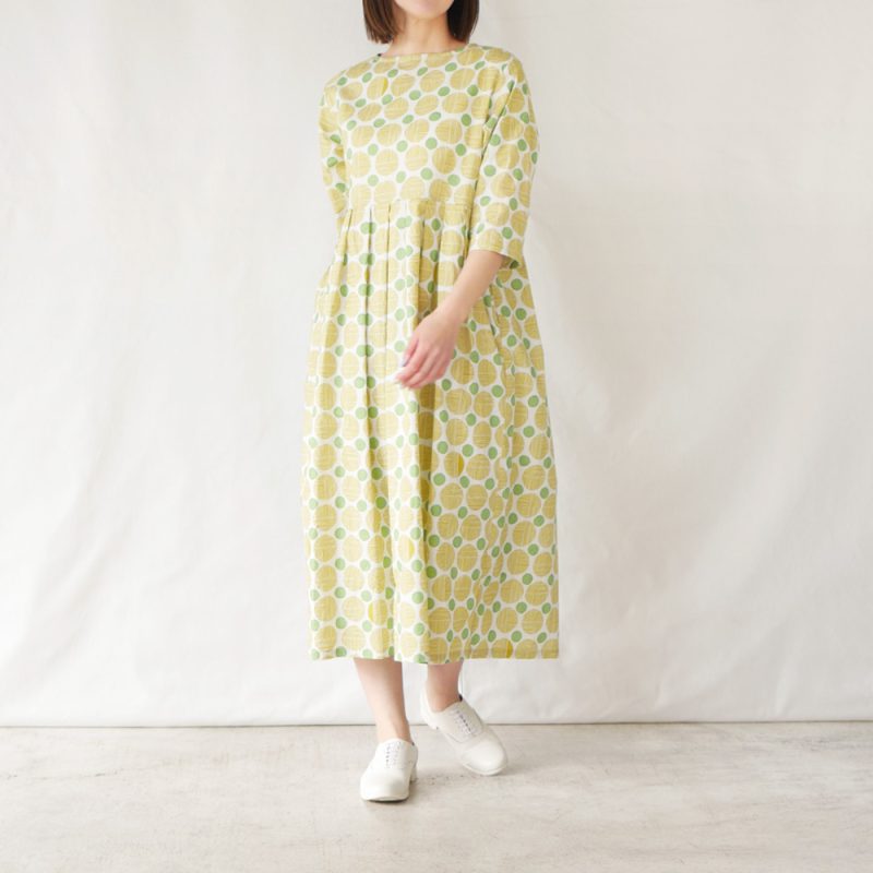⭐︎インドのブロックプリントのようにポンポンと手でスタンプを押したかのような風合いを、ポップなドット柄で表現しました。エスニックな要素を可愛いくポップに仕上げた柄は春の装いに彩りを加えます。