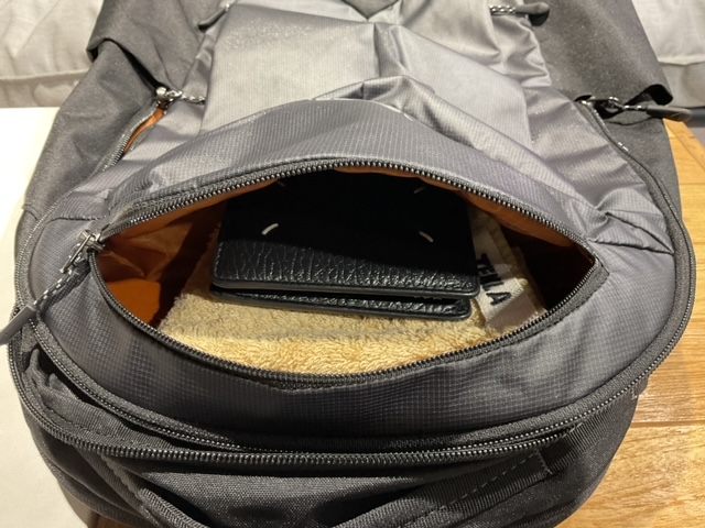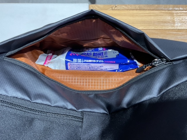 フロントポケットは左右で一つあり、左側のポケットは奥行きがあるので細々したものを沢山収納できます。
