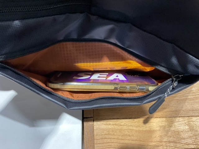 一方で左側のポケットは奥行きがないのでスマートフォンやイヤホンなど厚さがない物を収納できますよ