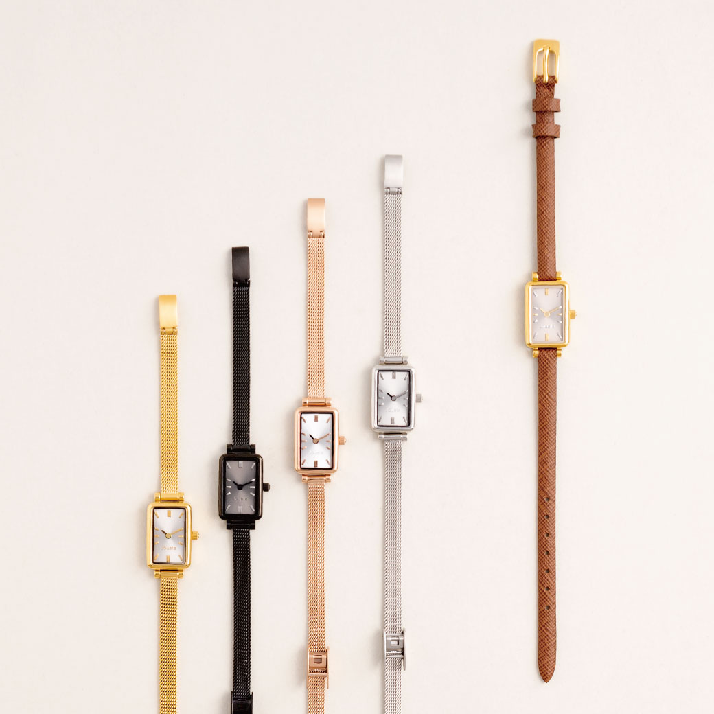 細身のベルトにスクエアフェイスをあしらった、すっきりとしたシルエットが印象的な「タイムピース」が登場。