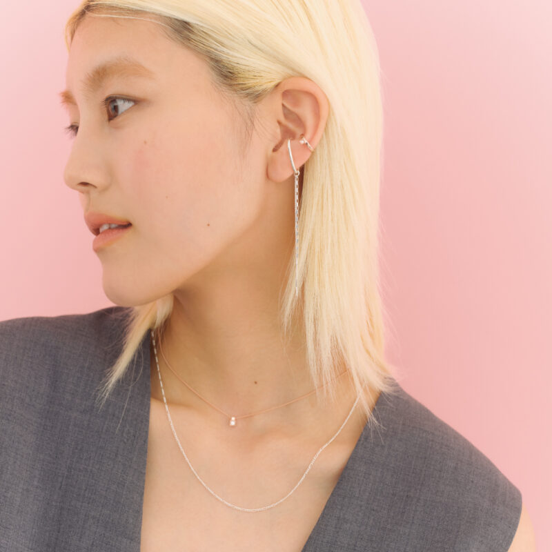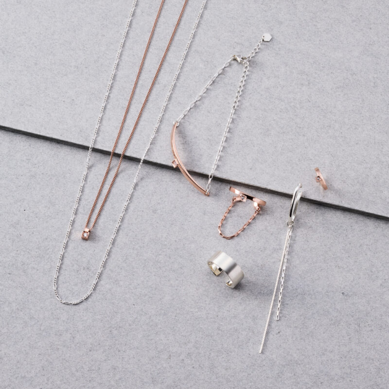 柔らかな空気を感じるピンクゴールド×シルバーに加えて、落ち着きがあり洗練された印象のブラック×シルバーもご用意。リング、イヤーカフス、ネックレスは2点セットなので、単品使いはもちろん重ねて楽しんでも◎