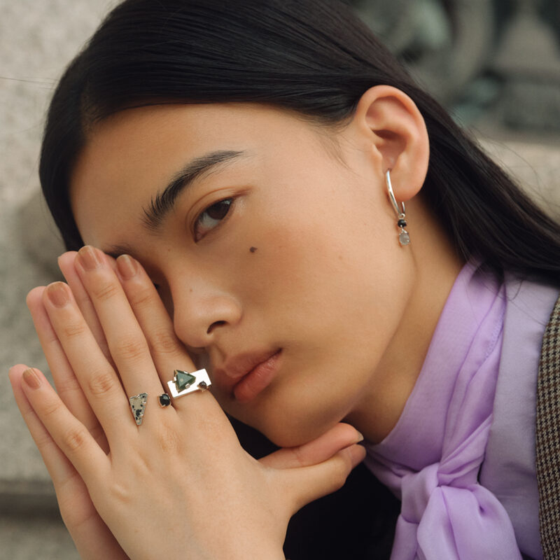 今季は、シックなスタイルに溶け込むジュエリーを提案。