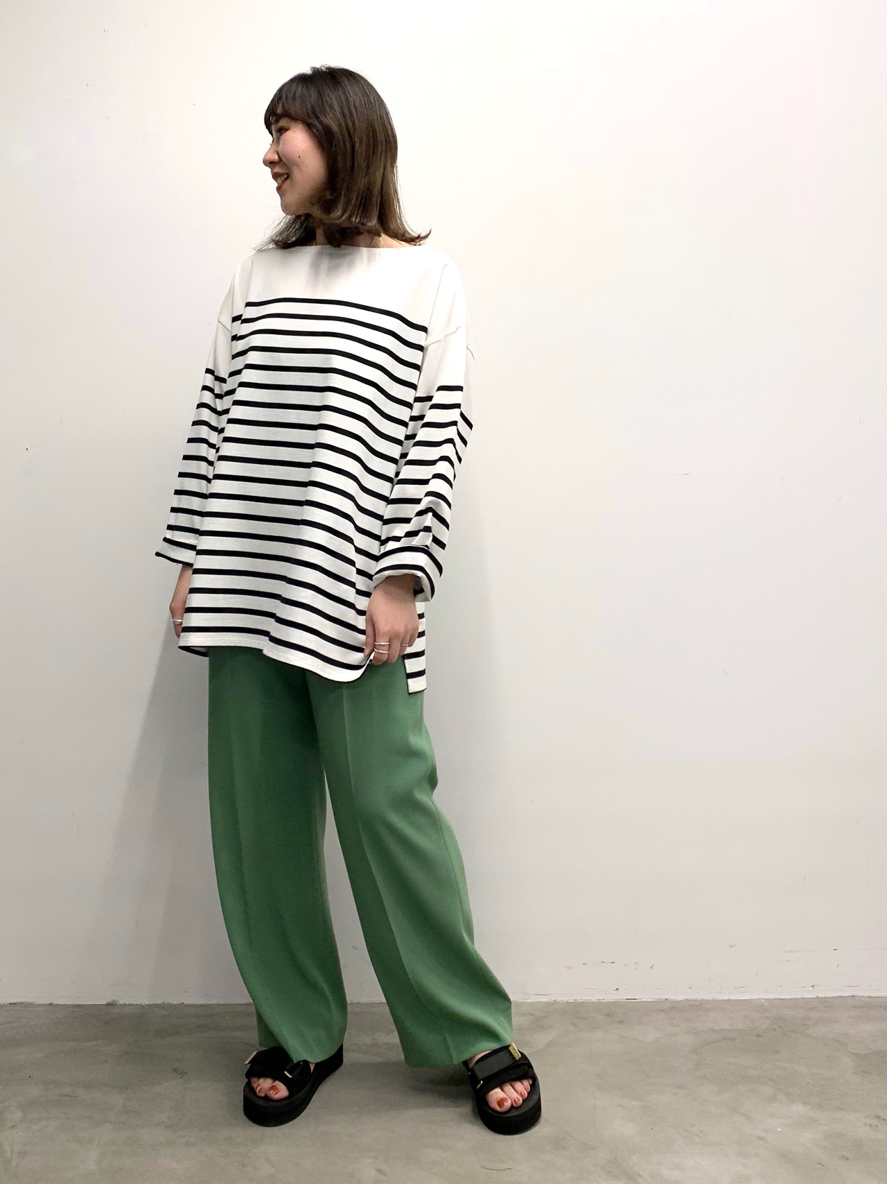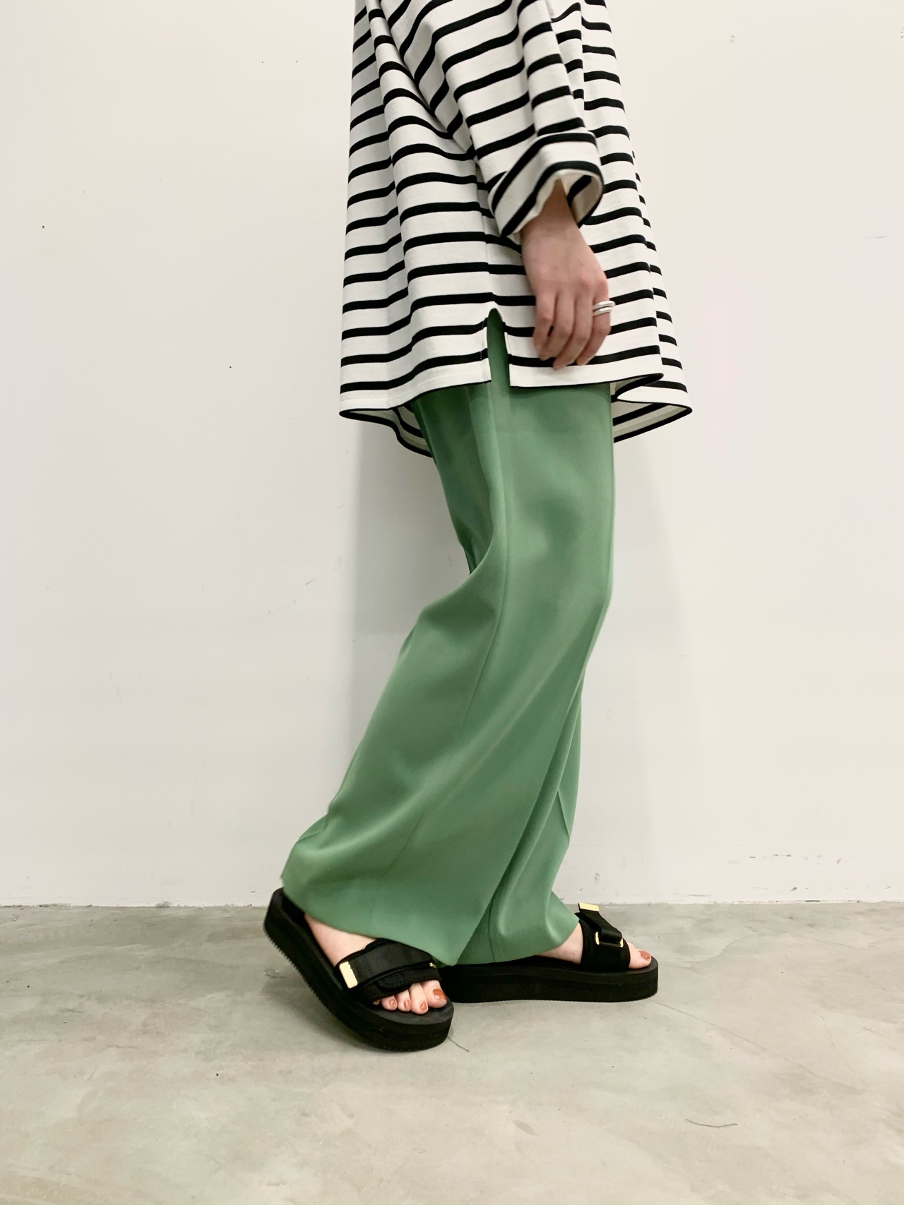 【ボーダーTee × バックサテンワイドパンツ】