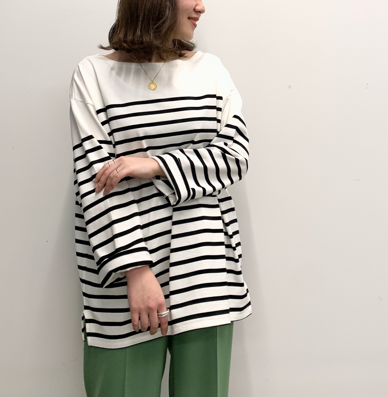 カットソーは、今っぽく着こなせるオーバーサイズのシルエットがポイントです。
