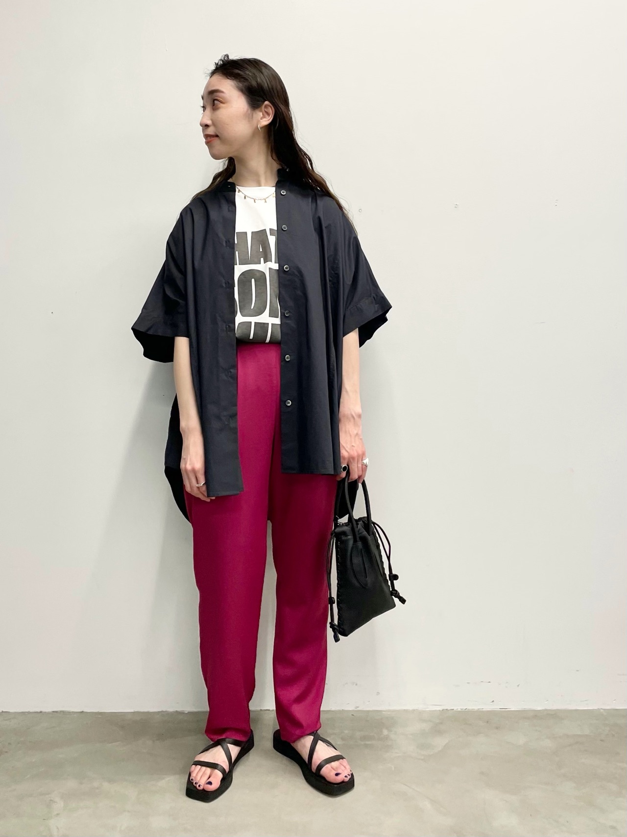 お袖を折り返してスッキリ見える、女性らしさを意識したスタイリングです。