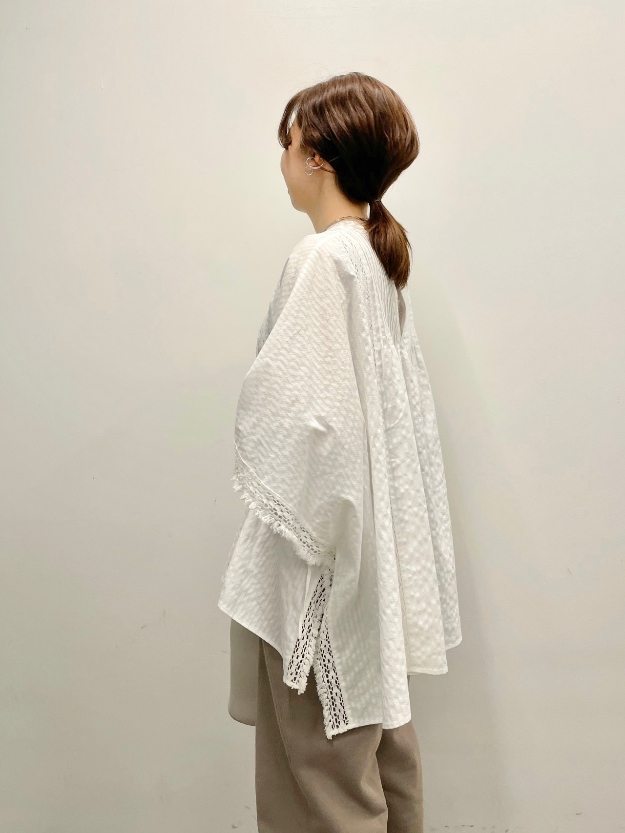 少し落ち感のあるきれいな素材感と胸元から入ったタック等のディテールがほんのりモードな印象も。