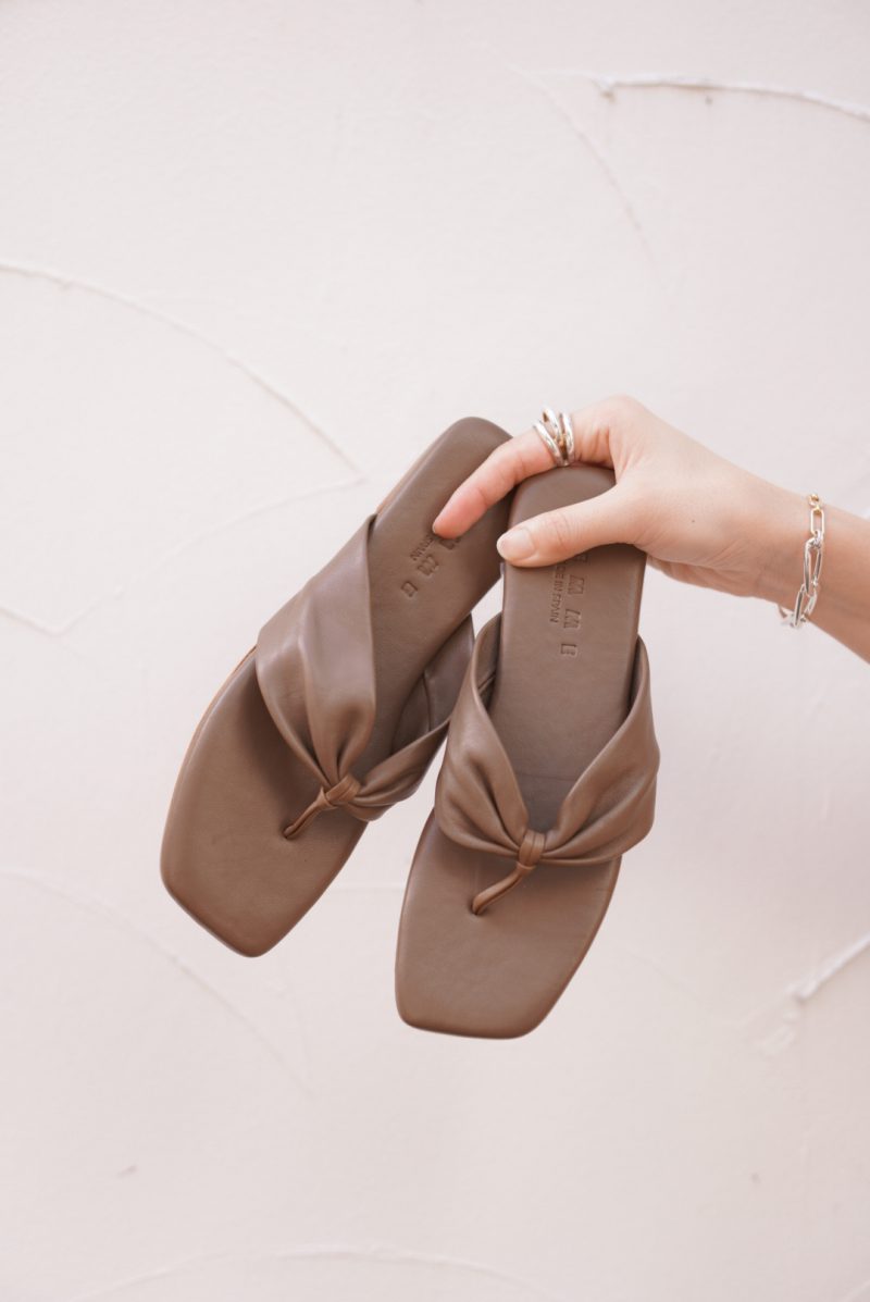 シンプルながら、柔らかく、女性らしい上品な雰囲気のあるトングサンダルは、