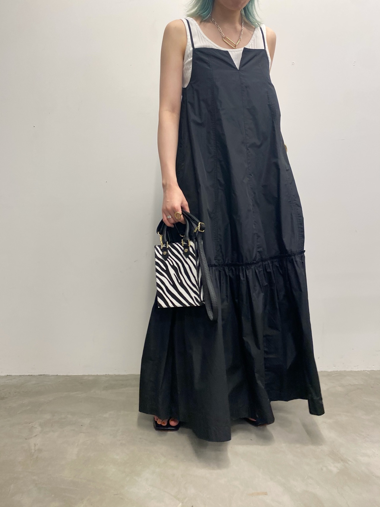 微光沢と軽やかなハリが特徴のメモリー素材で仕立てたティアードドレス。