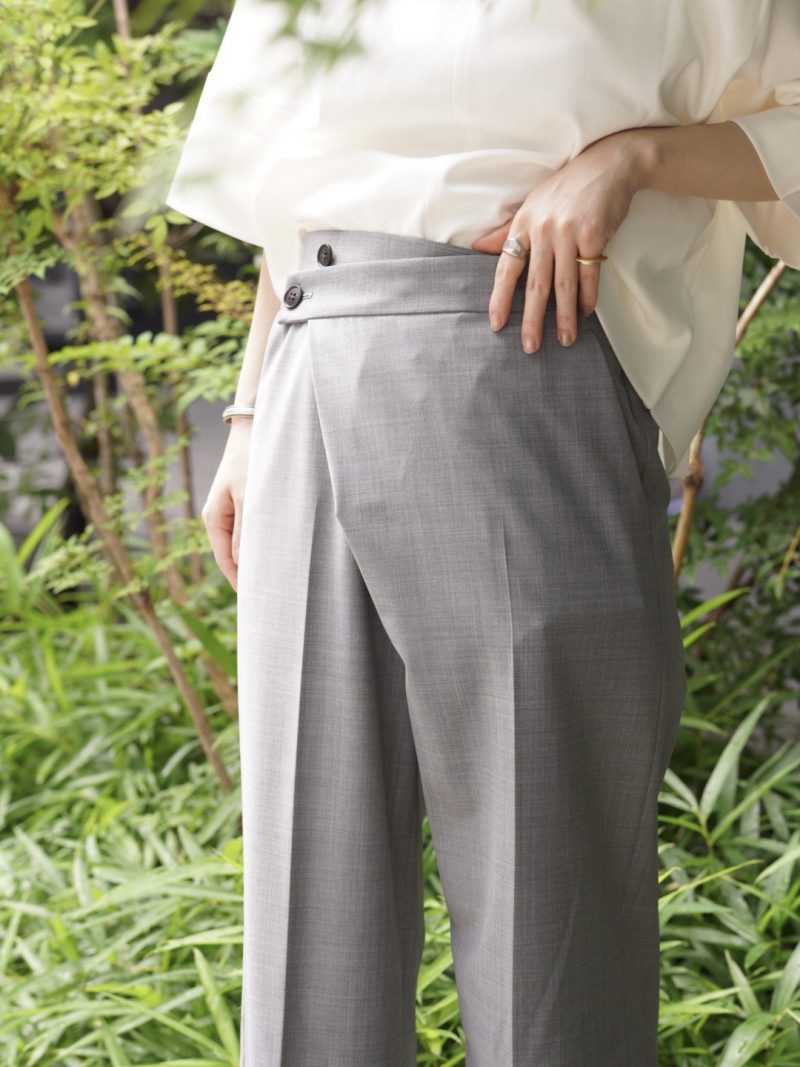 腰のボタンでウエスト位置を調整できる万能ラップパンツ。