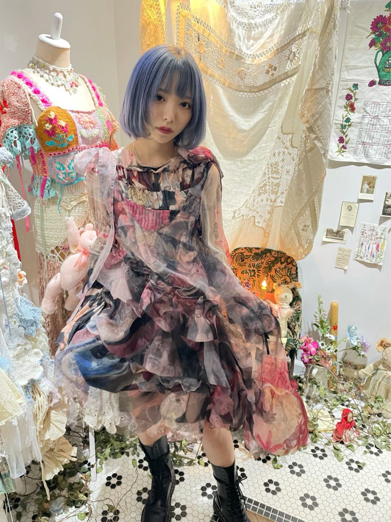 rurumu:より、画家の網代幸介氏の作品“smoke”をオーガンジー生地にプリントしたブラウスとワンピースが入荷しました。