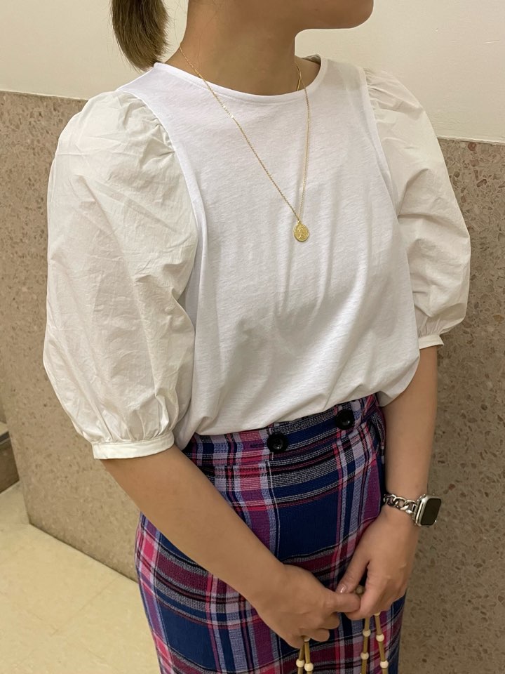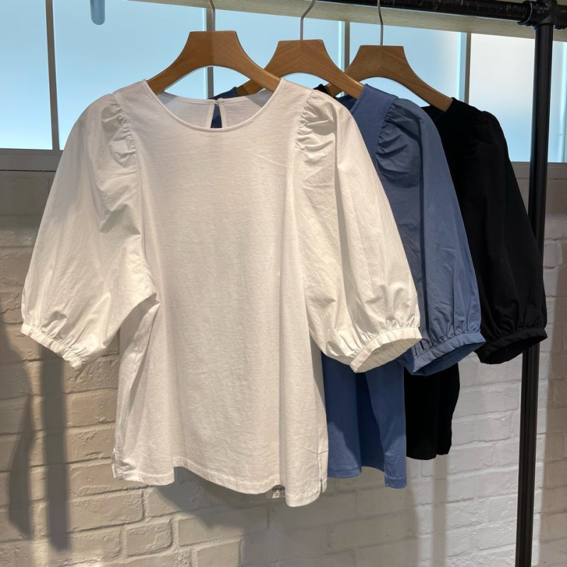 身頃はカットソー、お袖はハリ感のあるシャツ素材で、着心地とデザイン性を兼ね備えたトップスです♪
