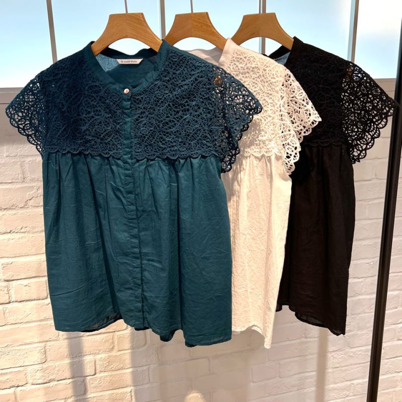 袖と胸元のレース、スッキリとしたバンドカラーがポイントのフレンチスリーブブラウス☆
