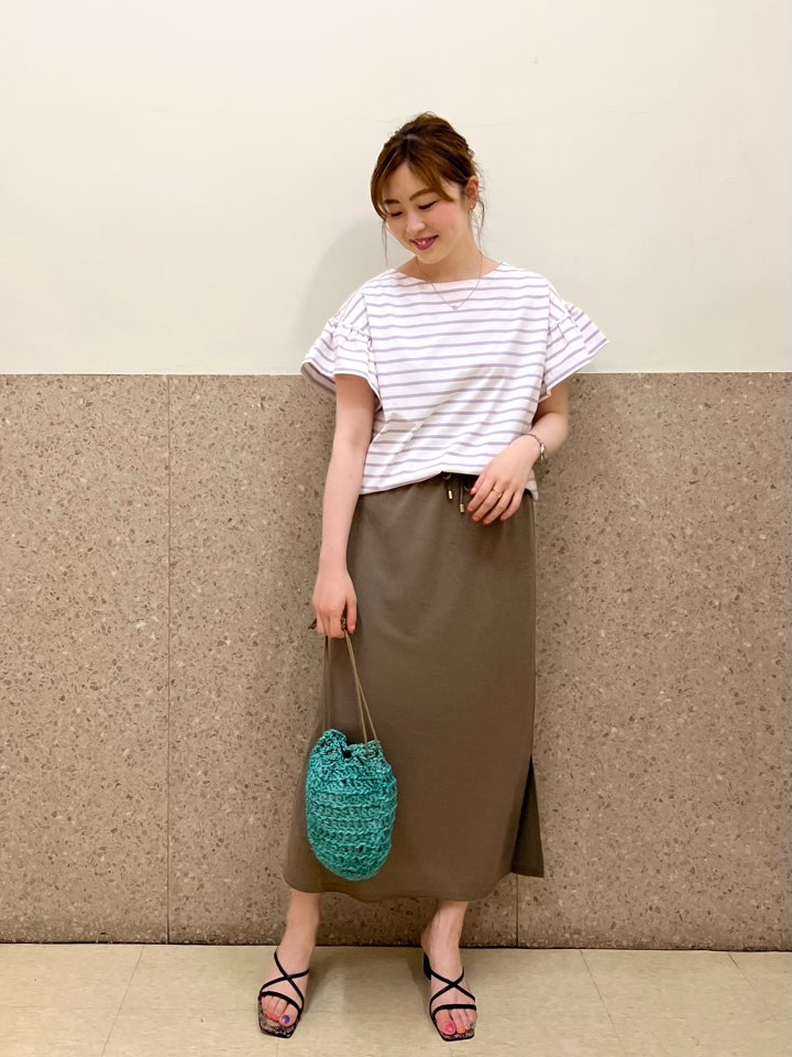 フェミニンになりすぎないよう、大人カジュアルなカラーのスカートでコーディネート☆