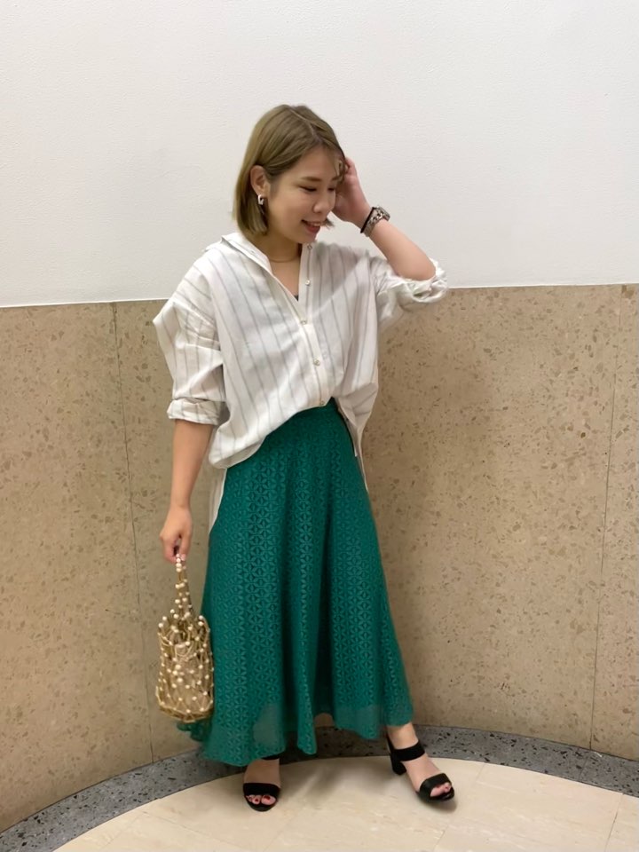 シャツのストライプが淡めの配色なのでレースとの柄コーデもおしゃれにまとまりますよ♪