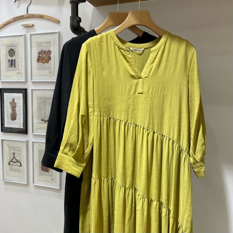 シボの入った生地とななめに入ったティアードデザイン、お袖のタックなど