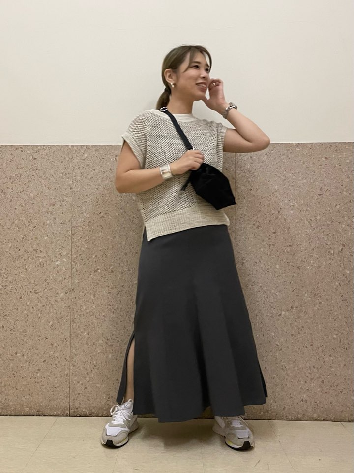 マーメイドラインとスリットが女性らしい印象ですが、ニットとスニーカーを合わせたカジュアルな着こなしです☆