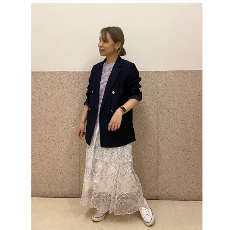 定番のネイビーカラーのジャケットはラベンダーカラーとレースのスカートを合わせてカジュアルダウンしました♪