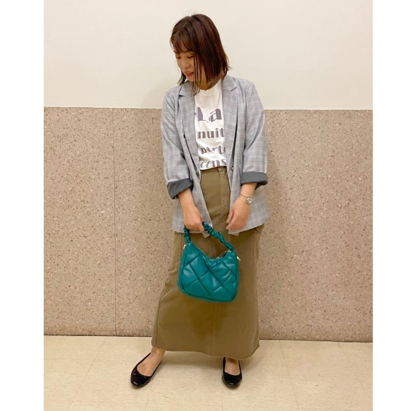 メンズライクになりすぎないように、スカートとシューズは女性らしくラフなスタイリングにしました☆