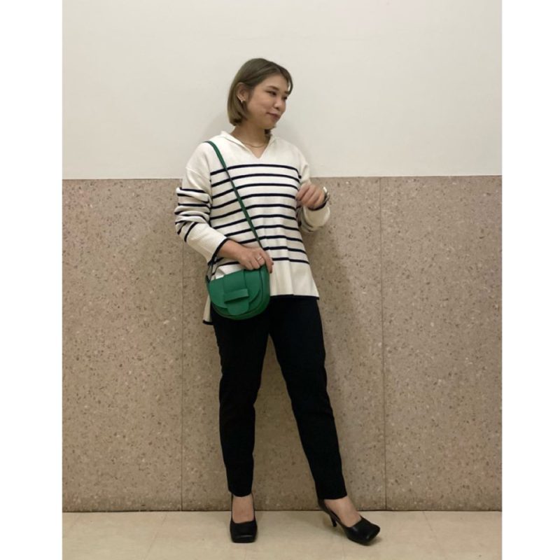 ボーダーニットと黒のテーパードパンツで、定番のスタイリングです♪