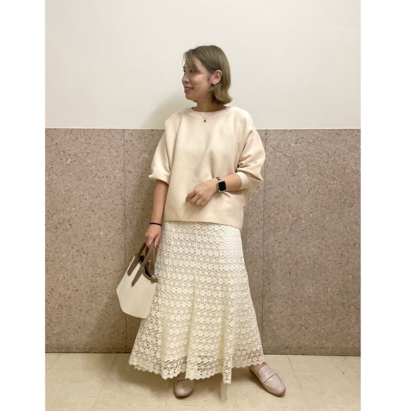 マーメイドラインなので腰まわりはすっきり履いて頂けるのでボリュームのあるトップスとも好相性ですよ!