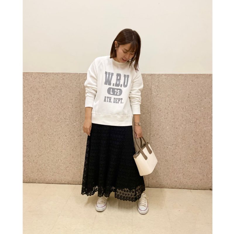 スカートは総レースですが黒だとフェミニンになりすぎず、カジュアルなスタイリングにも相性◎です!
