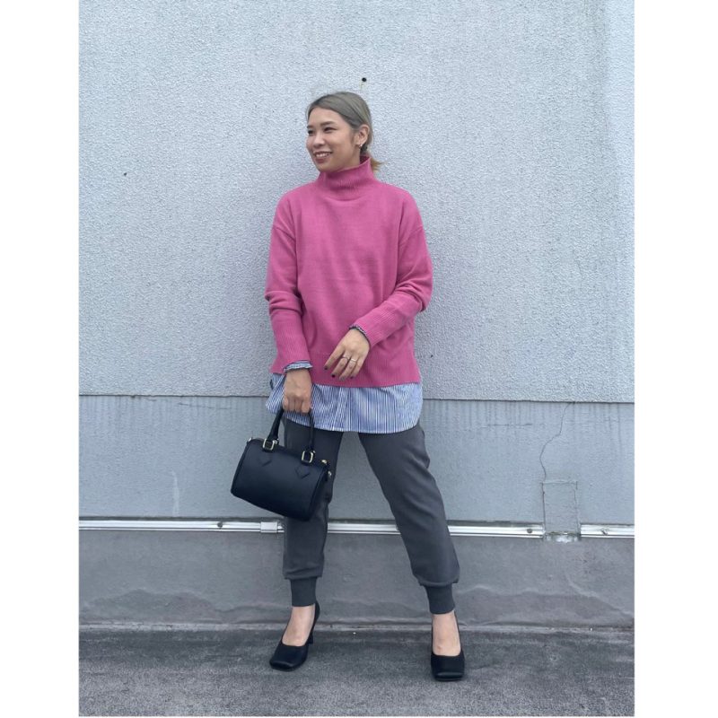 ハイネックニット、カーディガン共に裾がスリットになっており