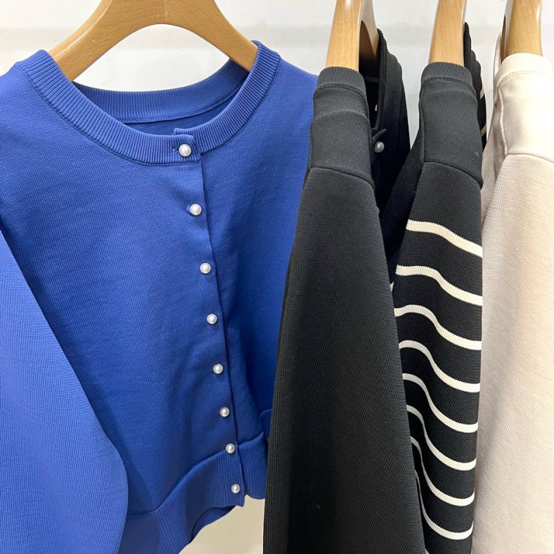 パールボタンとツルっとした生地感がクラシカルな印象のニットカーディガンのご紹介です☆