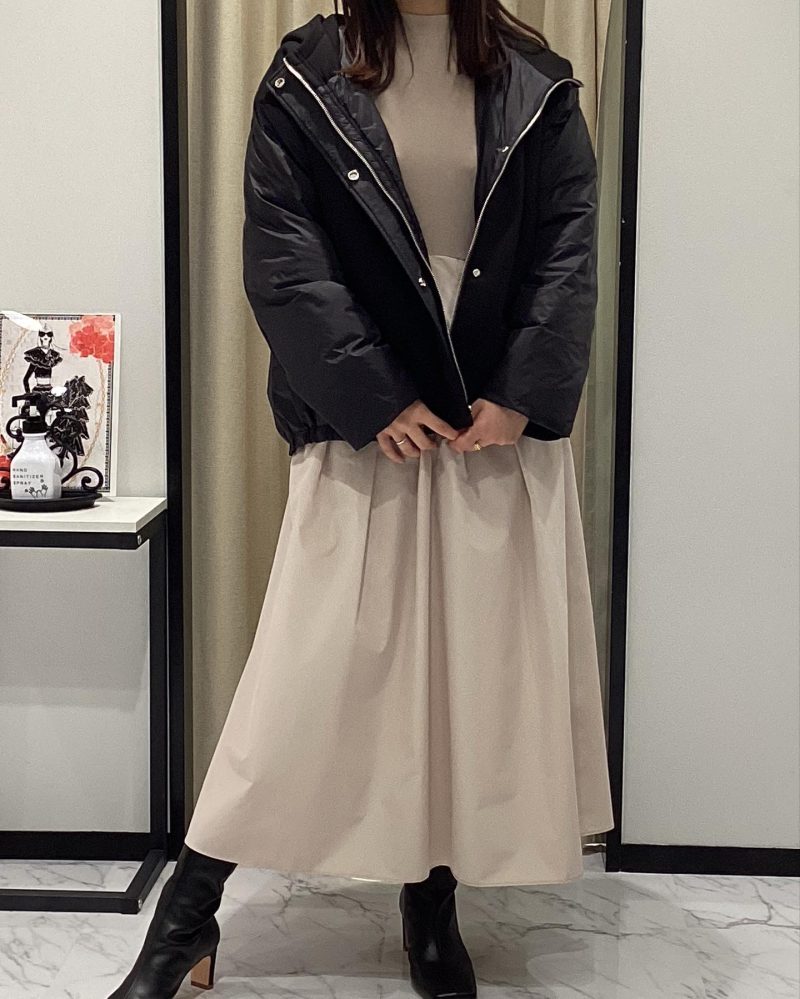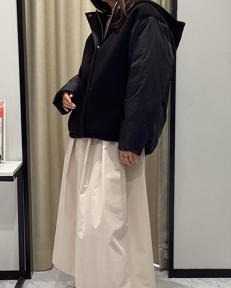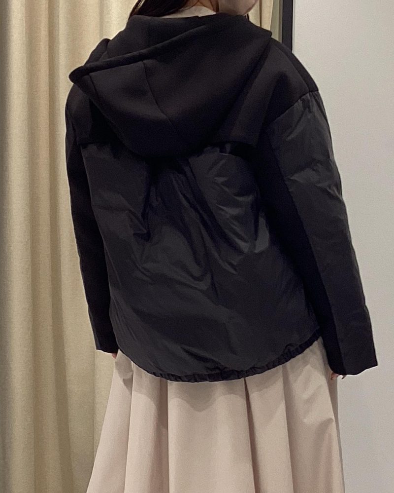 ナイロンとスポンジ素材をドッキングしたショート丈ダウンコートです。