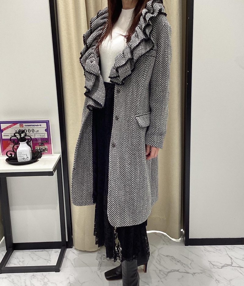 ヘリンボーンラッフルカラーウールコート