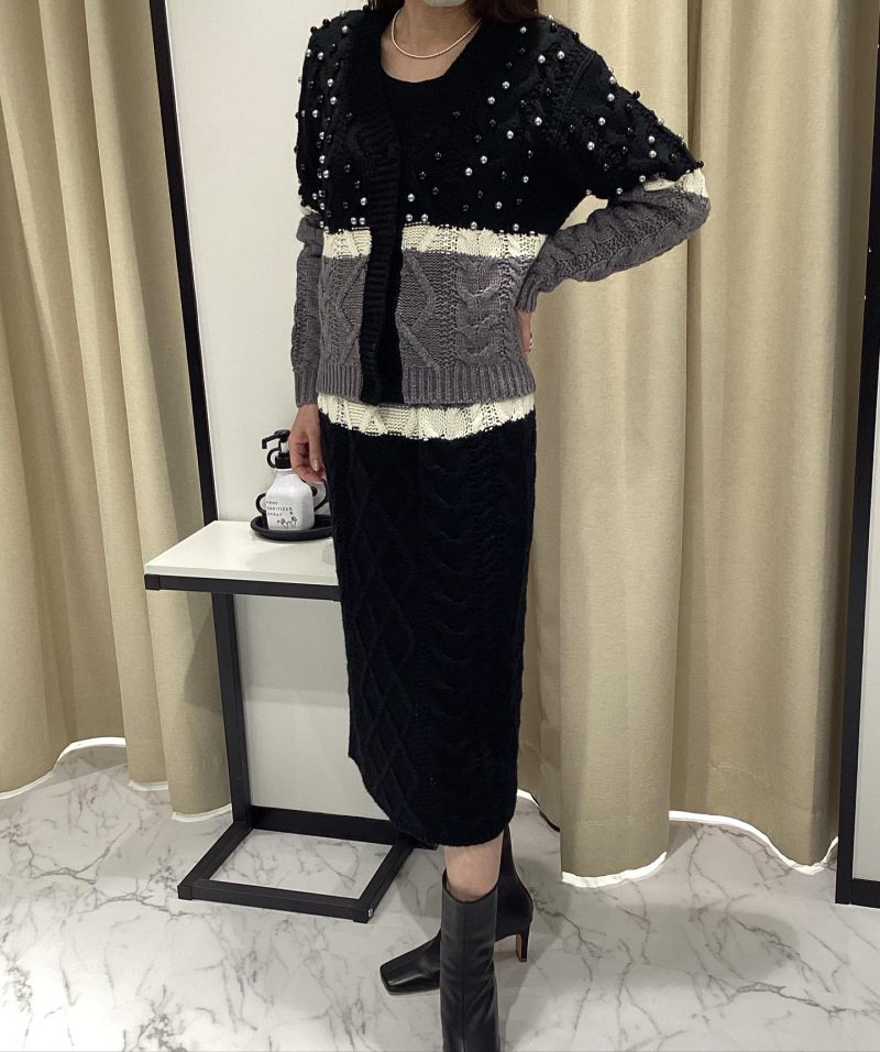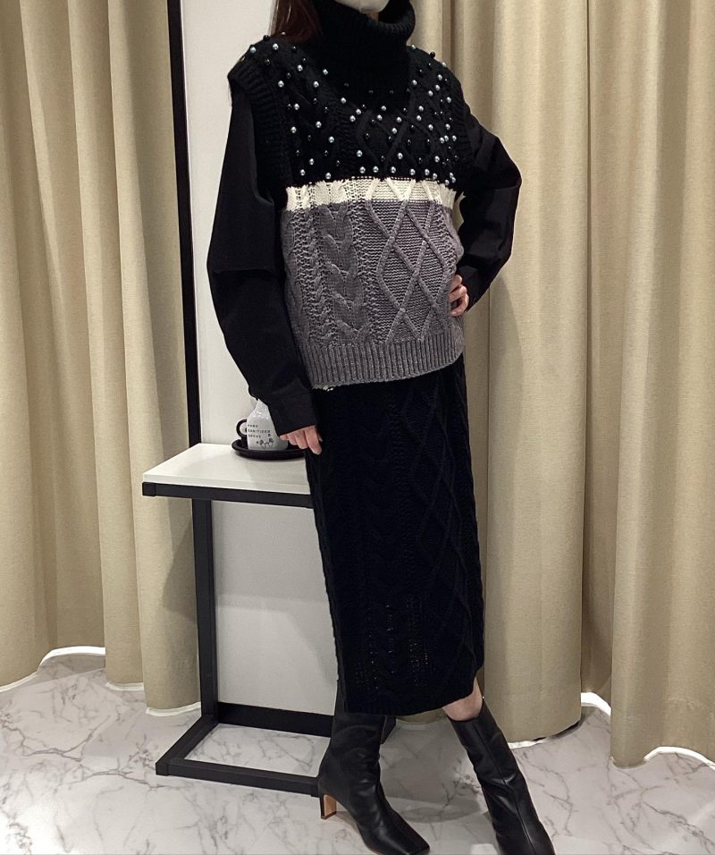 表情感のあるケーブル編みと配色のカラーリングが特徴のニットスカート。