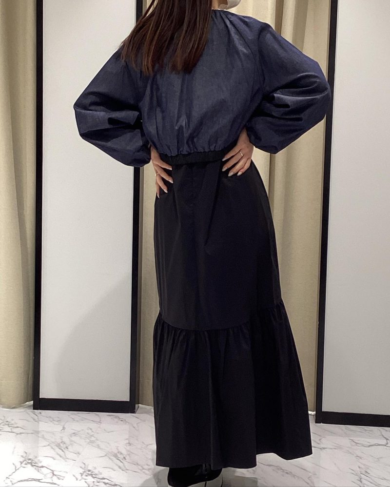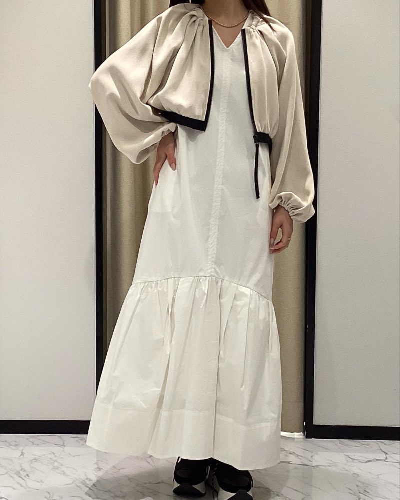ワンピースは裾で切り替えてボリュームディテールを入れたマーメイドデザインに。