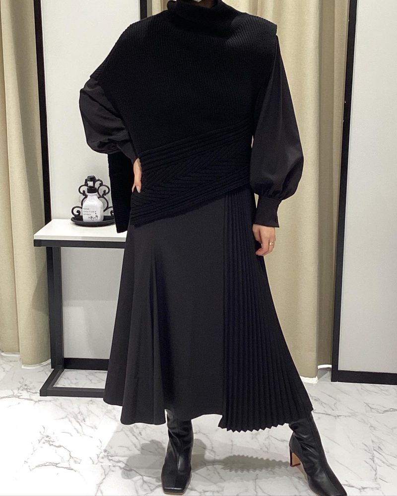 ケーブルをミックスしたニットベストはアシンメトリーなシルエットでモードな印象に。