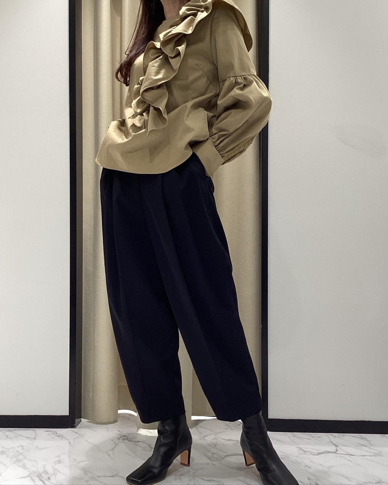 フロントとサイドにバルーンシルエットになるようタックがデザインされたパンツ。