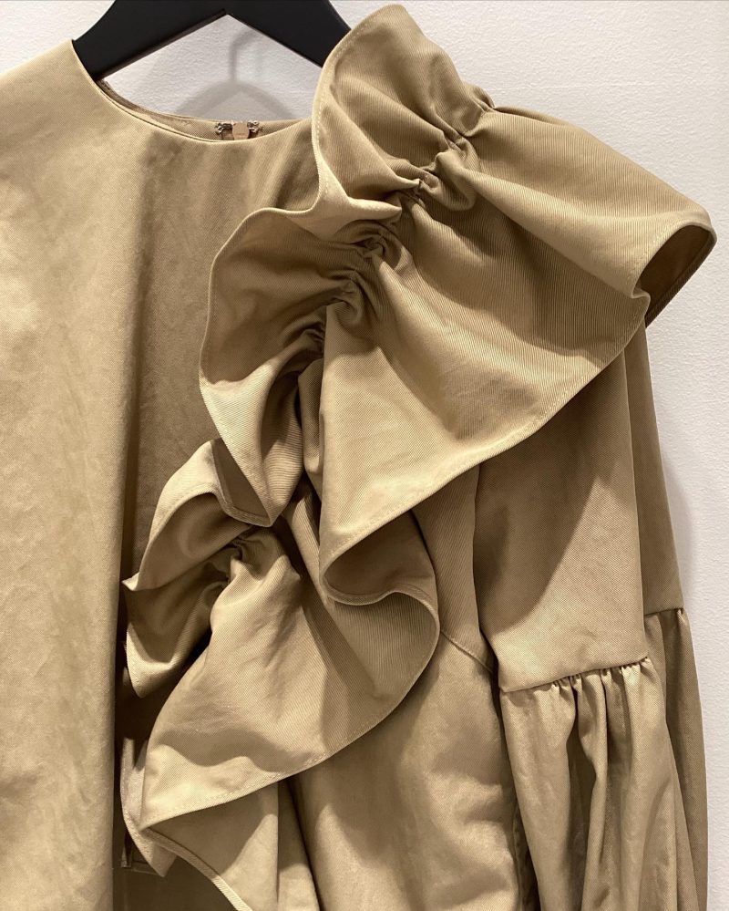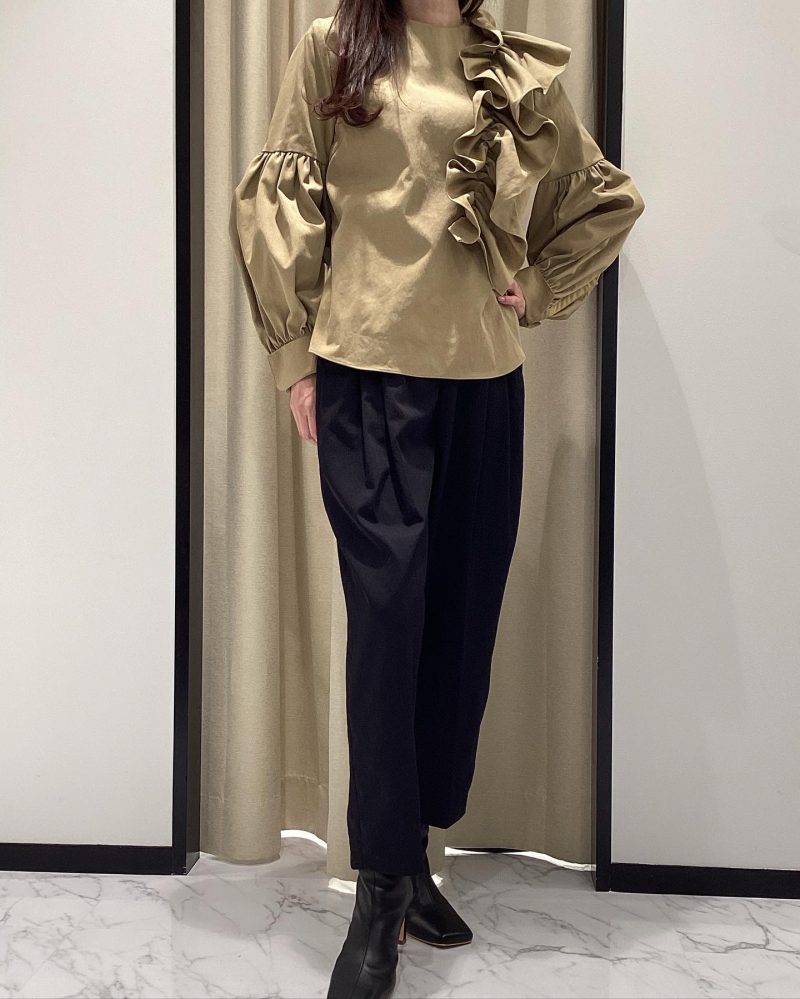 フロントに大き目のラッフルフリルを斜めに配し、カジュアルになり過ぎずモダンな印象に。