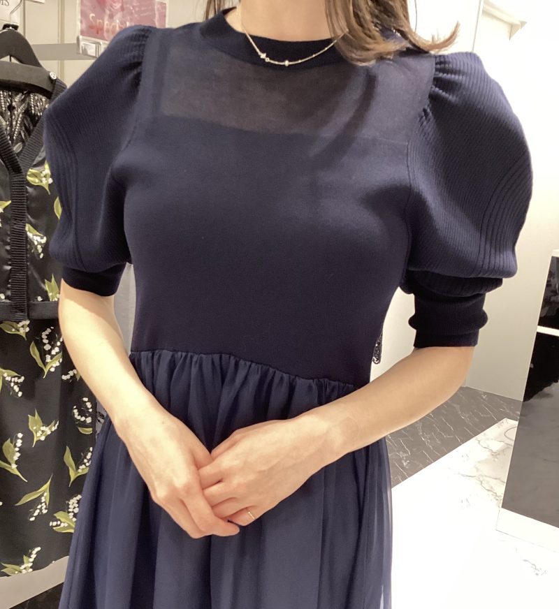 デコルテ周りの清涼感のあるニットとシアー素材のスカートの程よい透け感が