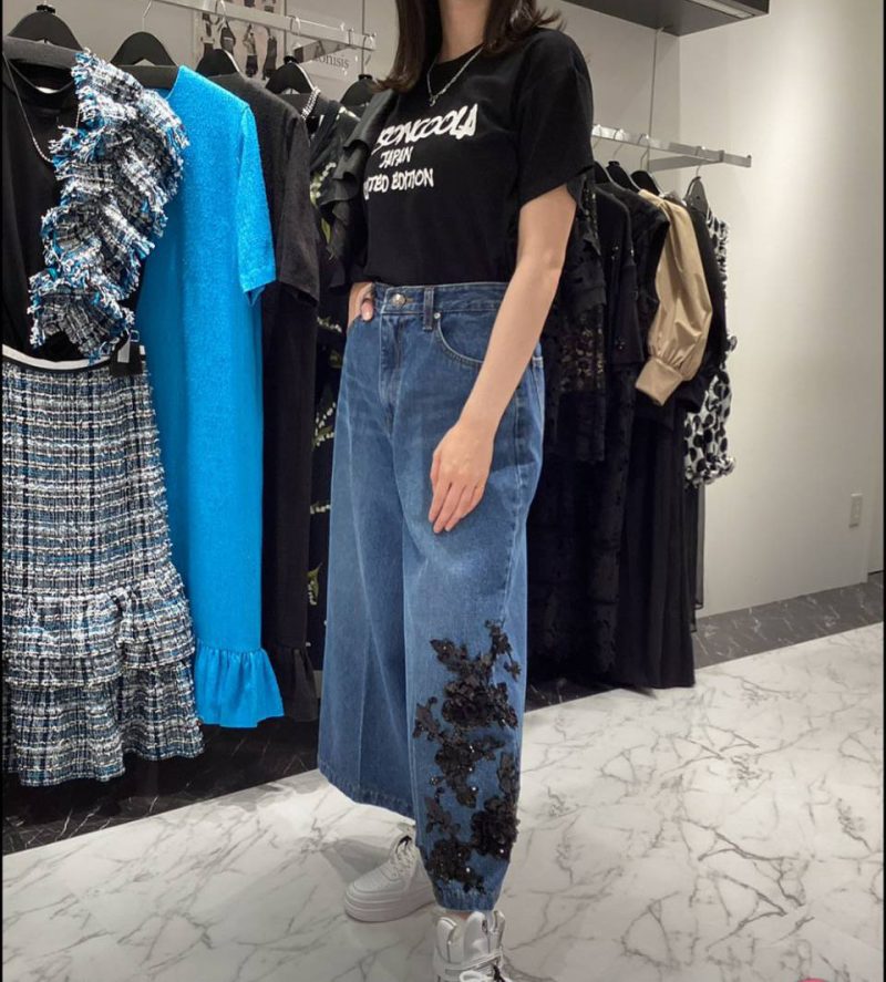 ビジューとレースのフラワーが施され、シンプルなコーデも華やかにしてくれるワイドデニムです♬