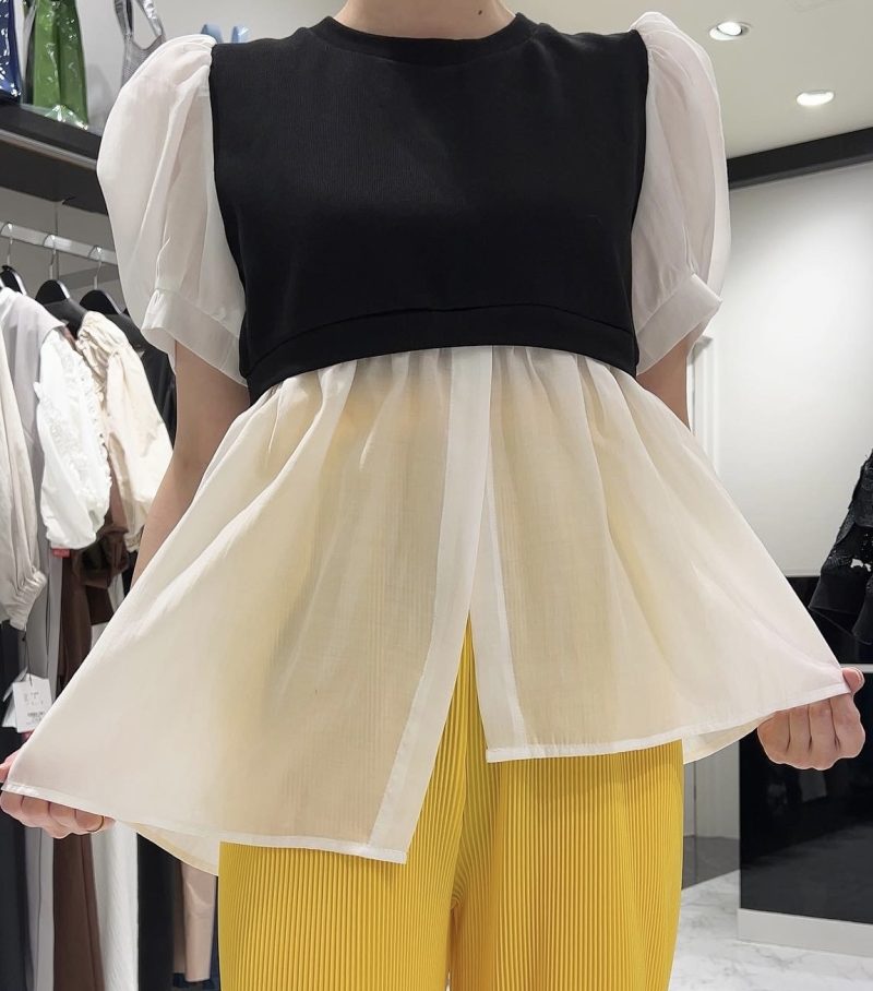 柔らかいシアー素材にクロップド丈のニットをレイヤードしたようなトレンドのデザイン♪