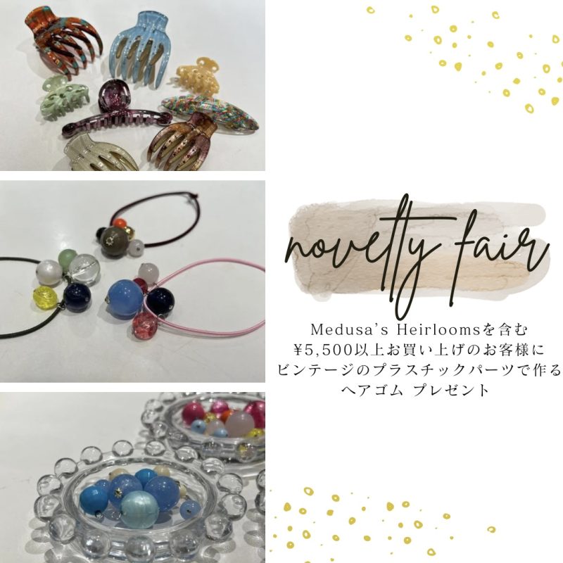 4f MAISEMAではヘアアクセサリーブランド、メデューサズエアルースを含む¥5,500(税込)以上お買い上げのお客様にビンテージのプラスチックパーツで作るオリジナルヘアゴムをプレゼント🎁