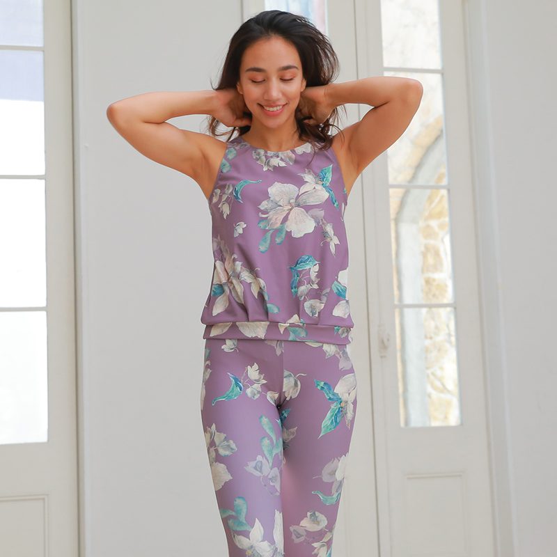 上品なベースカラーに華やかなフラワーが印象的なアクティブウェアです★フワッと見えるブラウジングデザインでお腹、腰回りをしっかり体型カバー!!バックスタイルの開いたデザインがお洒落ポイント♪