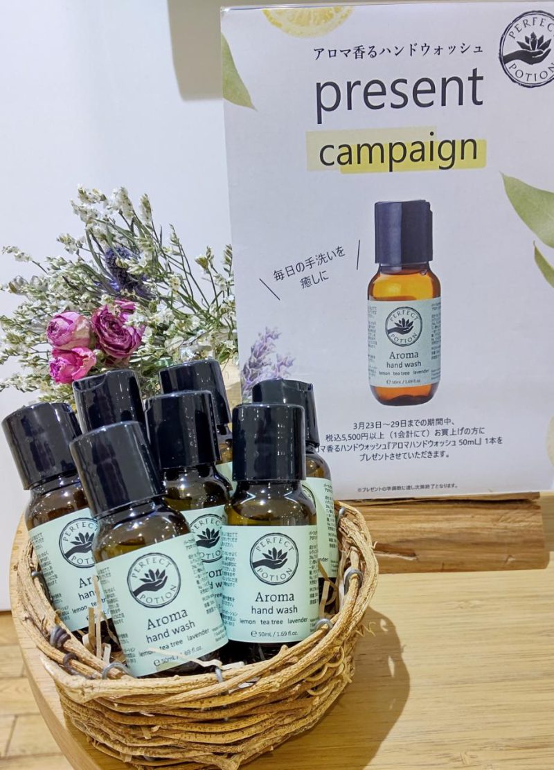 3月23日(水)から29日(火)までの期間中、税込み5,500円以上(1会計にて)お買い上げの方にフレッシュなアロマが香るハンドウォッシュ50mlを1本プレゼントさせていただきます。