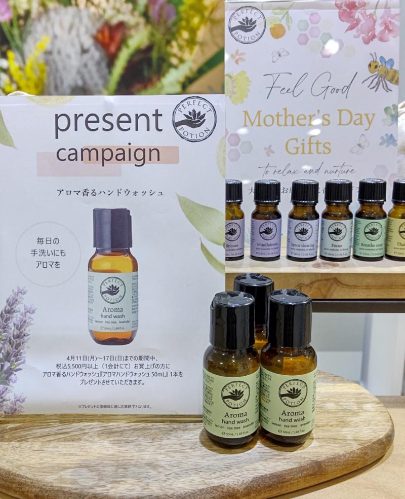 4月11日(月)から17日(日)までの期間中、税込み5,500円以上(1会計にて)お買い上げの方に、フレッシュなアロマが香るハンドウォッシュ50mlを1本プレゼントさせていただきます。